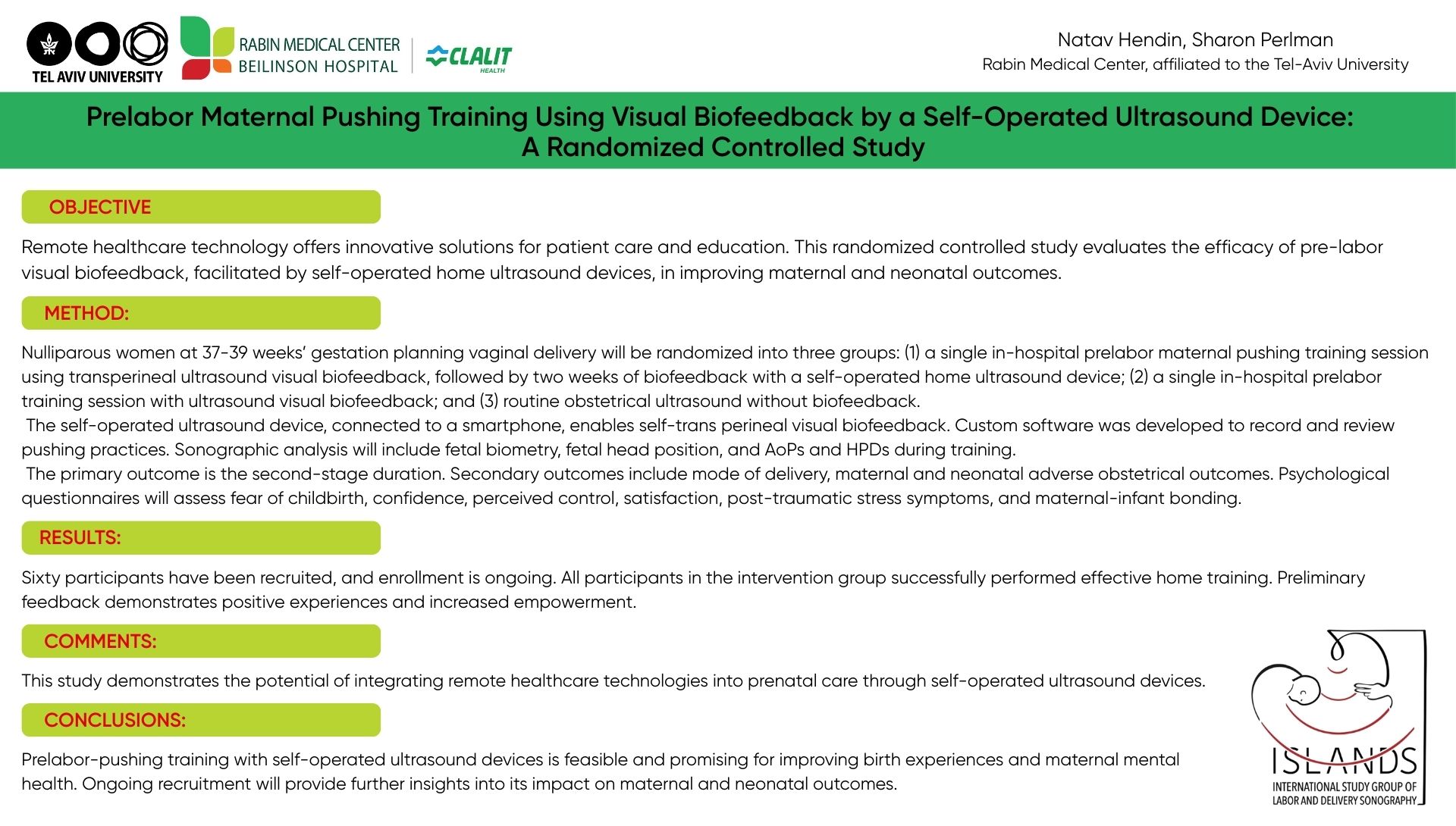 Prelabor-pushing training with self-operated ultrasound devices is feasible and promising for improving birth experiences and maternal mental health. Ongoing recruitment will provide further insights into its impact on maternal and